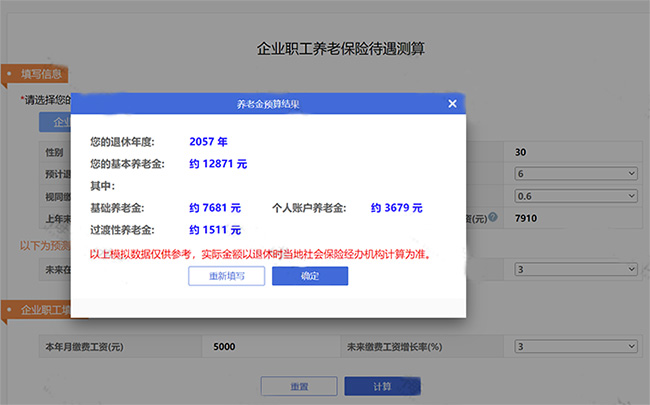 1、養(yǎng)老金測(cè)算公式 養(yǎng)老金計(jì)算公式:每月到手的養(yǎng)老金=月基礎(chǔ)養(yǎng)老金+月個(gè)人賬戶養(yǎng)老金 其中: (1)月基礎(chǔ)養(yǎng)老金=(全省上年度所有職工的月平均工資+本人指數(shù)化月平均繳費(fèi)工資)÷2×繳費(fèi)年限×1% (2)個(gè)人賬戶養(yǎng)老金=個(gè)人賬戶的余額÷計(jì)發(fā)月數(shù)(50歲為195、55歲為170、60歲為139) 2、月薪5000元,繳滿20年社保 退休能領(lǐng)多少養(yǎng)老金? 假設(shè)某位青島月薪5000元的男性,43歲才開始繳納社保,到63歲退休時(shí)正好繳滿20年。那他退休后能拿到多少養(yǎng)老金? 根據(jù)顯示,2023年度青島的平均工資為7910元/月。 另外,還需要假設(shè)幾個(gè)參數(shù),工資增長(zhǎng)率和個(gè)人賬戶記賬利率,通常都填入3%,方便計(jì)算器計(jì)算。 注:這個(gè)是預(yù)估數(shù)據(jù),實(shí)際情況可能會(huì)有差別 現(xiàn)在,我們根據(jù)上面的基礎(chǔ)信息,一起來(lái)算一算: 第一步:登錄“國(guó)家社會(huì)保險(xiǎn)公共服務(wù)平臺(tái)”,找到“養(yǎng)老保險(xiǎn)—企業(yè)職工養(yǎng)老保險(xiǎn)待遇測(cè)算”。