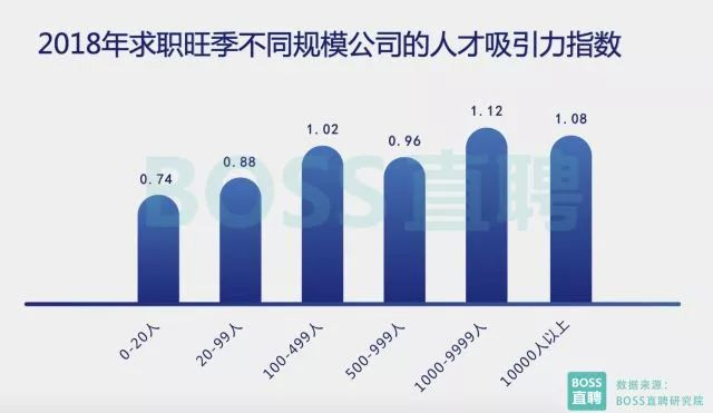 從求職者期望薪資的角度觀察,2018年前兩個月,全國50城求職者平均期望薪酬為9051元,同比增長3.3%。 期望月薪在1萬元以上的求職者比例從2017年的27.3%升至28.4%;期望月薪在2萬元以上的求職者比例上升0.2個百分點至6.5%,而期望月薪不足5000元的求職者比例同比下降1.6個百分點。 人才求職心態趨穩 中小企業加薪搶人 BOSS直聘研究院發現,在2018年跳槽旺季,1000-9999人規模的公司由于發展穩定系數高,且應聘難度及競爭壓力略低于萬人大廠,最受求職者歡迎。相比之下,中小企業在這個旺季依然面臨人才難求的困境。 100人以下的初創企業,人才吸引力不足0.9,大幅低于千人以上公司,20人以下的初創企業人才吸引力僅為0.74,反映出在近幾年競爭趨于白熱化,各細分領域排位逐漸清晰,資本集中向頭部企業傾斜的環境下,人才整體求職心態更趨于穩定。