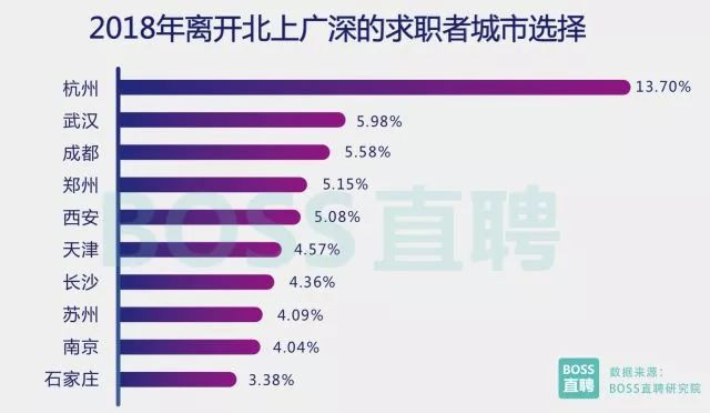 2 人才間的城市移動 新一線城市人才爭奪戰加劇 杭州武漢成都鄭州西安成第一集團 2017年,隨著“新一線”城市人才吸引政策的集中出臺,城市間“搶人集團”的排位雛形已經顯現。 BOSS 直聘研究院數據顯示,2018年前兩個月,一線城市(北上廣深)人才繼續流出至二三線城市,凈流出率達到 0.6%,較2017年同期增加0.05個百分點。 相應地,二線城市人才吸引力也繼續增強,其中杭州、武漢、成都、鄭州、西安五個城市人才吸引力最高,2018年離開北上廣深的求職者,有35.5%的人選擇了這五所城市。而且,這一趨勢已經在18個月左右的區間里相對穩定,這五個城市成為“新一線”城市搶人的第一集團。