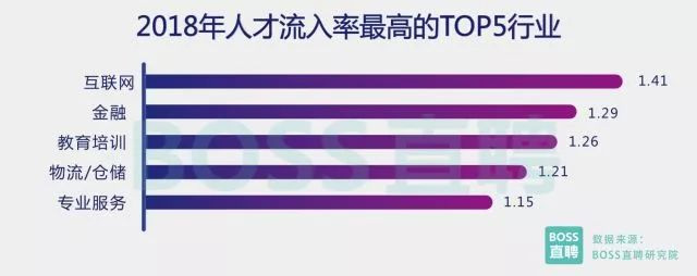 與薪資排名前十的行業相比,貿易、冶金、化工等傳統行業表現低迷,2018年平均招聘薪資普遍在6500元 以下,薪資增幅普遍低于1%,機械設備行業的平均薪酬還小幅下降了0.7%。 互聯網行業依然是最熱門領域 教育與物流行業異軍突起 根據BOSS直聘研究院的觀察,2018年求職旺季,人才流入率最高的五個行業中,互聯網和金融行業依然穩 居前兩名。 有趣的是,教育培訓和物流/倉儲行業,分別得益于知識經濟崛起及營商環境改善帶來的迅速發展, 人才吸引力大幅增強。2018年,這兩大領域人才凈流入比例甚至將過去深受求職者青睞的專業服務與通信行業 甩在身后。