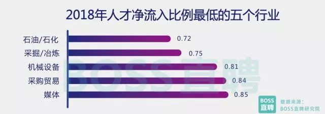 在新興行業沖擊下,傳統行業正在面臨愈發嚴峻的人才危機。BOSS直聘研究院數據顯示,以能源/化工為代 表的部分傳統行業,人才凈流出比例正逐漸走高。 這種情況的出現,一方面與部分傳統行業集中去產能和自動 化水平升級,導致崗位需求下降有關,另一方面也與新興行業表現強勢,人才吸引力超過傳統行業有很大關系。