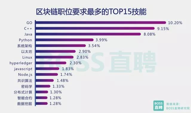 4、區塊鏈相關崗位的技能要求 BOSS直聘研究院發現,超過80%的區塊鏈相關職位對求職者的技能要求在3項及以上,技術類人才除了需掌 握常用開發語言外(C++,Java,Go),還需要對密碼學、共識算法、超級賬本、智能合約等有足夠了解。