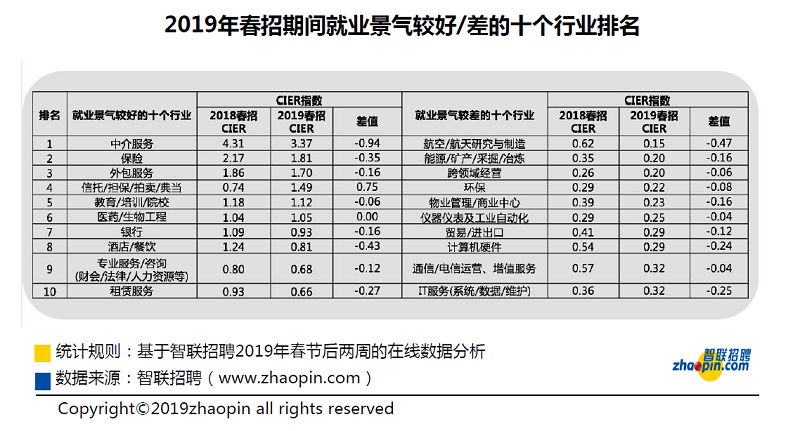 從求職端的數(shù)據(jù)來(lái)看,春招期間找工作的人數(shù)同比增加了4%,簡(jiǎn)歷投遞次數(shù)同比增加18%,這表明單個(gè)求職者較去年投遞了更多的簡(jiǎn)歷,且求職人數(shù)在增加,需求人數(shù)在減少的趨勢(shì)將整體影響今年春招的就業(yè)景氣度。 2019年春招期間就業(yè)景氣度低于去年 綜合供需兩端的情況,2019年春招期間的CIER指數(shù)降為1.55,較2018年的1.68略有下滑,證明今年春招期間的求職競(jìng)爭(zhēng)程度更激烈,平均一個(gè)求職者對(duì)應(yīng)1.55個(gè)用人需求。 二、東部就業(yè)形勢(shì)墊底,中介服務(wù)業(yè)的景氣度高居榜首 東部地區(qū)春招就業(yè)景氣度落后東北,一線城市競(jìng)爭(zhēng)依然激烈 數(shù)據(jù)顯示,2019年春招期間CIER指數(shù)仍呈現(xiàn)中部、西部、東北以及東部地區(qū)依次遞減的趨勢(shì)。同比來(lái)看,今年的CIER指數(shù)較去年均略有下滑,東部地區(qū)產(chǎn)業(yè)發(fā)展比較先進(jìn),人才競(jìng)爭(zhēng)也比較集中,因此春招旺季這一地區(qū)的就業(yè)壓力也是*大的,景氣度墊底。 從不同城市等級(jí)看,2019年春招期間CIER指數(shù)仍呈現(xiàn)一線、新一線、二線、三線及四線城市依次遞增的趨勢(shì)。其中,僅三、四線城市的CIER指數(shù)大于1,表明在這些城市中,企業(yè)招聘需求人數(shù)要大于求職申請(qǐng)人數(shù);一線、新一線、二線城市的CIER指數(shù)小于1,說(shuō)明企業(yè)招聘需求人數(shù)要小于求職申請(qǐng)人數(shù)。智聯(lián)招聘調(diào)研顯示,大多數(shù)求職者仍然希望在更大的城市就業(yè),因此大城市的競(jìng)爭(zhēng)也往往會(huì)更激烈。 中介服務(wù)業(yè)的景氣度高居榜首,傳統(tǒng)加工制造業(yè)轉(zhuǎn)型陣痛依然明顯 數(shù)據(jù)顯示,從2019年春季求職期間排名結(jié)果來(lái)看,就業(yè)形勢(shì)最好的行業(yè)是中介服務(wù)業(yè),CIER指數(shù)高達(dá)3.37,其次是保險(xiǎn)及外包服務(wù),CIER指數(shù)分別為1.81、1.70。服務(wù)業(yè)為代表的第三產(chǎn)業(yè)因?yàn)榉?wù)業(yè)的升級(jí)和社會(huì)轉(zhuǎn)型的需要,正在持續(xù)釋放需求,吸納就業(yè)的能力十分強(qiáng)大。值得注意的是,2019年春招期間,在就業(yè)形勢(shì)較好的前十大行業(yè)中,除了信托/擔(dān)保/拍賣/典當(dāng)和醫(yī)藥/生物/工程的CIER指數(shù)是高于2018年春季求職的,其他的行業(yè)的CIER指數(shù)都低于去年。 在就業(yè)景氣較差的行業(yè)中,2019年春招期間航空/航天研究與制造業(yè)的就業(yè)景氣程度最差,CIER指數(shù)僅為0.15,其次是能源/礦產(chǎn)/采掘/冶煉業(yè),為0.20,傳統(tǒng)加工制造業(yè)的就業(yè)形勢(shì)仍然堪憂,在去年備受關(guān)注的貿(mào)易/進(jìn)出口行業(yè),在春招旺季景氣度同比下行。