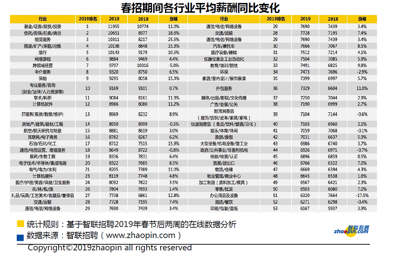 | 智聯(lián)招聘發(fā)布《2019春季人才流動(dòng)報(bào)告》春招平均薪酬為8,165元 |