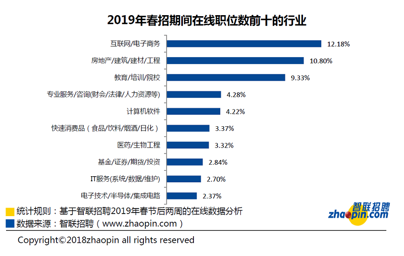 大企業(yè)薪酬誘人,小微企業(yè)工資低于平均線 數(shù)據(jù)顯示,2019年春招期間,企業(yè)規(guī)模越大,平均薪酬越高。在10,000人以上的巨無(wú)霸企業(yè)工作的員工,平均薪酬最高,為9,329元,其次是1,000-9,999人的大公司,平均薪酬為9,053元,平均薪酬最低的是小微企業(yè)的員工,為7,601元。企業(yè)規(guī)模越大,意味著具有成熟的盈利能力和完善的薪酬福利體系,員工的利益能夠得到*大程度的保障,因此平均薪酬越高。 外商薪酬最高,民營(yíng)企業(yè)的平均薪酬最低 數(shù)據(jù)顯示,2019年春招期間,外企的平均薪酬最高,為9,070元,其次是上市公司,平均薪酬為8,913元,薪酬最低的是民營(yíng)企業(yè),平均薪酬僅為8,025元。 四、互聯(lián)網(wǎng)、房地產(chǎn)行業(yè)人才彈藥充足,教育、醫(yī)藥工程等新興熱門行業(yè)招工難 互聯(lián)網(wǎng)/電子商務(wù)行業(yè)用工需求*大 智聯(lián)招聘數(shù)據(jù)顯示,從春季需求量*大的十大行業(yè)來(lái)看,互聯(lián)網(wǎng)/電子商務(wù)、房地產(chǎn)/建筑/建材/工程、教育/培訓(xùn)/院校行業(yè)成為前三甲。這個(gè)排名和2018年的保持一致,盡管互聯(lián)網(wǎng)行業(yè)經(jīng)過(guò)了2018年招聘需求全線下降的經(jīng)歷,仍然是穩(wěn)坐吸納就業(yè)的寶座的“頭號(hào)玩家”。值得注意的是,電子技術(shù)/半導(dǎo)體/集成電路進(jìn)入了需求前十的行業(yè),這和國(guó)家去年開(kāi)始大力支持中國(guó)發(fā)展自己的芯片有關(guān),政策的傾斜會(huì)讓電子技術(shù)/半導(dǎo)體/集成電路行業(yè)的市場(chǎng)更加廣闊,因此企業(yè)的用人需求也隨之大增。既然有新的行業(yè)上榜,也就代表有其他的行業(yè)熱度在下降,貿(mào)易/進(jìn)出口行業(yè)在2018年在企業(yè)發(fā)布的在線職位數(shù)中排名第八,今年的排名下滑到第11名,或受到中美貿(mào)易摩擦對(duì)發(fā)展信心的影響所致。