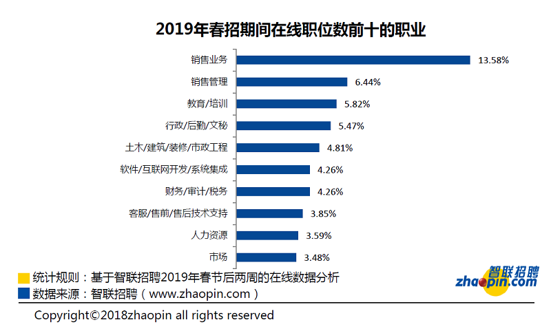 教育/培訓(xùn)/院校持行業(yè)人才缺口大 智聯(lián)招聘數(shù)據(jù)顯示,從春季供給量*大的十大行業(yè)來(lái)看,排名前三的行業(yè)是房地產(chǎn)/建筑/建材/工程、互聯(lián)網(wǎng)/電子商務(wù)、計(jì)算機(jī)軟件行業(yè),其中房地產(chǎn)/建筑/建材/工程行業(yè)的求職人數(shù)遠(yuǎn)大于企業(yè)需求,而近年來(lái)持續(xù)釋放需求的教育/培訓(xùn)/院校行業(yè)卻面臨門可羅雀的尷尬處境,盡管該行業(yè)的簡(jiǎn)歷投遞熱度不低,但是距離行業(yè)的實(shí)際需求仍有一定的差距。 開(kāi)疆拓土,銷售人員需求最旺 智聯(lián)招聘數(shù)據(jù)顯示,從春季需求量*大的十大職位來(lái)看,銷售業(yè)務(wù)、銷售管理、教育/培訓(xùn)排名前三,而2018年前三大職位是銷售業(yè)務(wù)、行政/后勤/文秘、軟件/互聯(lián)網(wǎng)開(kāi)發(fā)/系統(tǒng)集成。其中銷售相關(guān)崗位位居需求榜首,不難理解,在企業(yè)追求發(fā)展盈利的過(guò)程中,急需銷售角色的員工開(kāi)拓市場(chǎng),貢獻(xiàn)利潤(rùn)。在春招期間需求次之的是行政、財(cái)務(wù)、人力資源等職能型崗位,這類崗位是公司經(jīng)營(yíng)管理的基礎(chǔ),不可或缺,用人需求長(zhǎng)期存在。