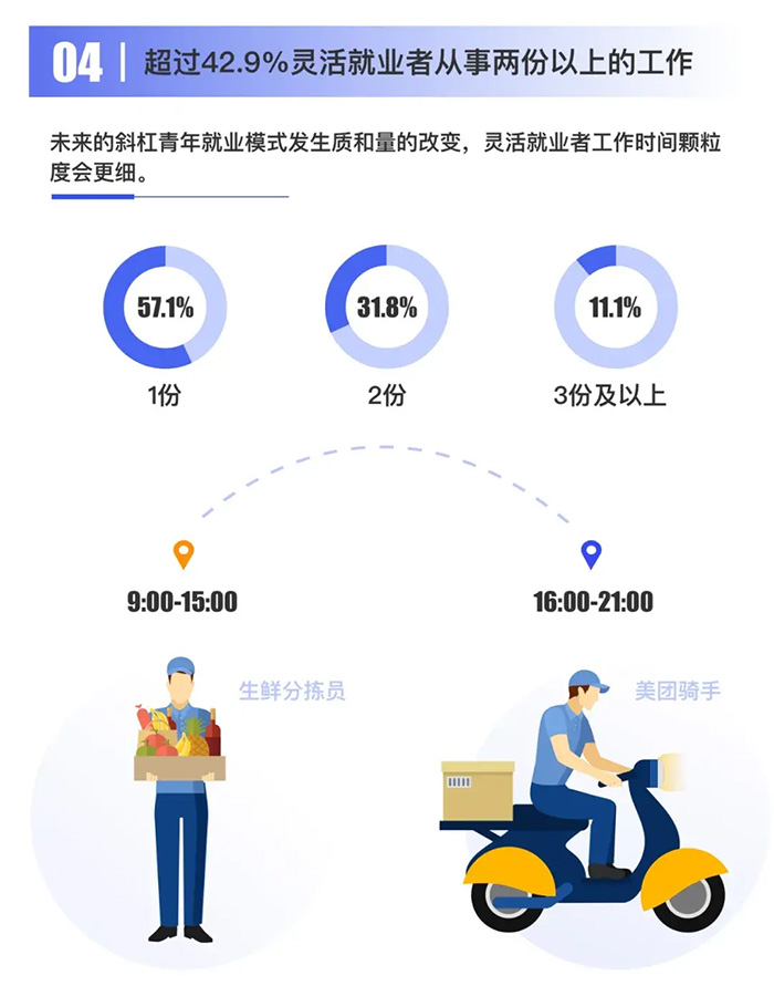 報告指出:按次收費、按單量收費是典型的基于任務的收費方式。靈活就業從業者面對眾多勞動任務,具有一定的選擇空間,多勞多得,不勞不得,可以靈活安排自己的工作時間。靈活是靈活就業的重要特性。 趨勢四:超過42.9%靈活就業者從事兩份以上的工作