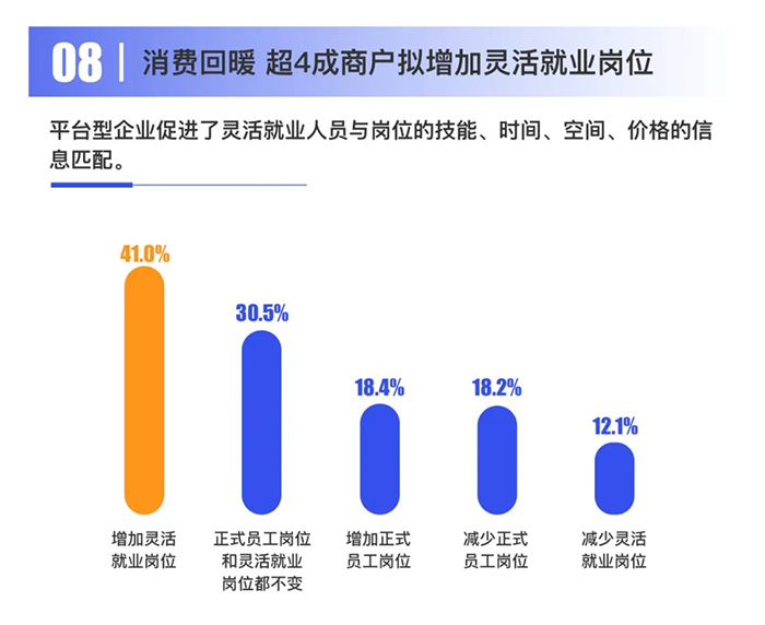 在對未來的發展規劃上,因為靈活就業具有收入方式靈活、工作時間靈活等特性,56.8%的生活服務業靈活就業從業者仍打算繼續從事靈活就業(包括做從業者和 自主創業兩種情況)。其中,20.0%的從業者因從事靈活就業增長了見識,提升了能力,打算走上自主創業之路。 趨勢八:消費回暖 超4成商戶擬增加靈活就業崗位