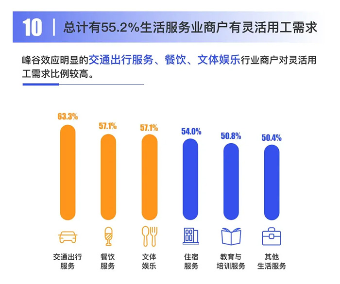 ![]() 生活服務業商戶選擇靈活用工的原因(可多選)中,55.6%的商戶選擇“靈活用工按需付費,能夠應對疫情等不確定性因素”,39.4%的商戶選擇“靈活用工成本低”, 29.4%的商戶選擇“人員需求有季節性、周期性、時間段特征”。 趨勢十:總計有55.2%生活服務業商戶有靈活用工需求