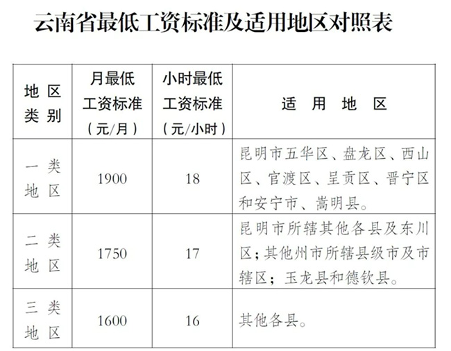 2022年8月16日,云南省人社廳公布《關于調整最低工資標準的通知》,通知中明確將從2022年10月1日起調整云南省最低工資標準,三檔分別為1900元、1750元、1650元。