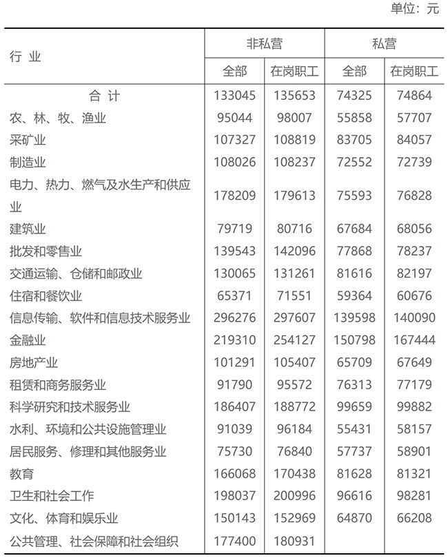 2023年浙江省: 非私營(yíng)單位就業(yè)人員年平均工資為133045元,比2022年度增加4220元,增長(zhǎng)3.3%,扣除價(jià)格因素,實(shí)際增長(zhǎng)3.0% 私營(yíng)單位就業(yè)人員年平均工資為74325元,比上年增加2391元,增長(zhǎng)3.3%,扣除價(jià)格因素,實(shí)際增長(zhǎng)3.0% 2、2023年度單位就業(yè)人員分行業(yè)年平均工資表