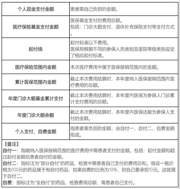 01 教你讀懂醫(yī)保結(jié)算單 一般來(lái)說不同地區(qū)經(jīng)濟(jì)發(fā)展情況有所不同,因此各地醫(yī)保報(bào)銷的具體細(xì)節(jié)不盡相同。但是醫(yī)保報(bào)銷單上的一些專業(yè)詞語(yǔ)是相同的。 比如:起付標(biāo)準(zhǔn)、自費(fèi)藥品、基本醫(yī)療之外費(fèi)用等。今天就幫大家解析一下,結(jié)算單上各個(gè)費(fèi)用名稱,來(lái)幫助大家迅速讀懂醫(yī)保報(bào)銷:
