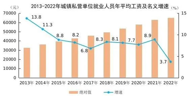 2022年全國城鎮非私營單位就業人員年平均工資為114029元,比上年增加7192元,名義增長6.7%。扣除價格因素,2022年全國城鎮非私營單位就業人員年平均工資實際增長4.6%。