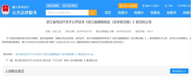 近期,浙江省司法廳關于公開征求《浙江省婚假規定(征求意見稿)》意見的公告中提到依法辦理結婚登記的職工,享受婚假十天,參加婚前醫學檢查的,增加婚假三天。