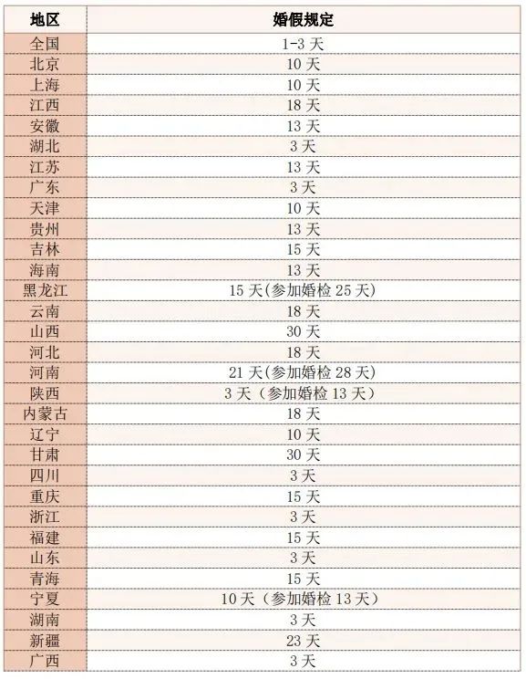 目前國家法定規定的婚假是3天,但是各地在不同的基礎上適當延長了婚假天數,其中黑龍江、河南、陜西、寧夏等地若主動參加婚檢,可以獲得額外的婚假“獎勵”。