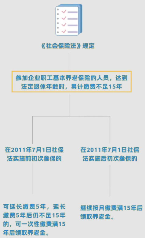其中《社會保險法》實施(2011年7月1日)前參保,延長繳費5年后仍不足15年的,可以一次性繳費至滿15年。