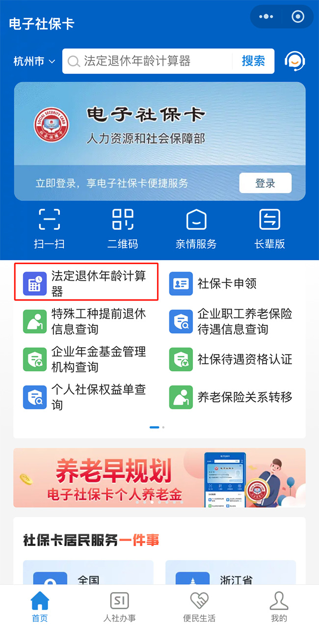 2、本人對應的法定退休年齡查詢 參保人員查詢本人法定退休年齡,可以通過4個人力資源和社會保障部的官方線上服務渠道查詢: (1)國家社會保險公共服務平臺; (2)全國人社政務服務平臺; (3)電子社??? (4)“掌上12333”APP。 通過上述途徑訪問“退休年齡計算器”,輸入本人的出生日期、性別等信息,即可查詢對應的法定退休年齡和退休年月。