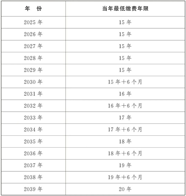 此外,參保人員還可以通過撥打12333咨詢服務熱線、前往社會保險經辦機構服務窗口等線下方式,查詢本人法定退休年齡。 3、關于最低繳費年限 2029年12月31日前,職工按月領取基本養老金最低繳費年限仍為15年。 從2030年1月1日起,按照每年提高6個月的節奏,將職工按月領取基本養老金最低繳費年限由15年逐步提高至20年。 提高最低繳費年限情況表: